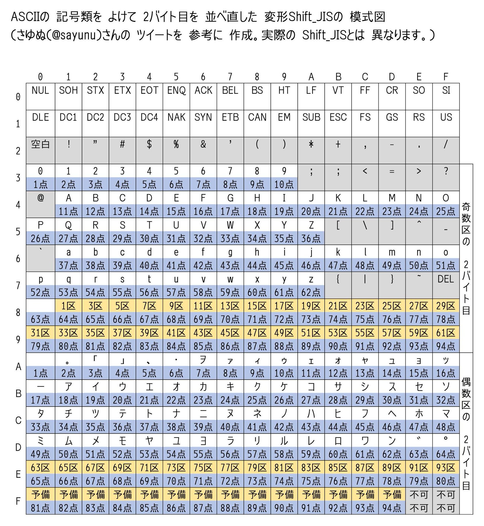 ソケセテ בטוויטר Asciiの 記号類を よけて ダメ文字を 回避した 変形shift Jisの 模式図です ギリギリ Jis X 0208の 文字集合が 収まります 黄色 2バイト文字の 1バイト目 青 2バイト文字の 2バイト目 参考にした ツイート さゆぬ Sayunu